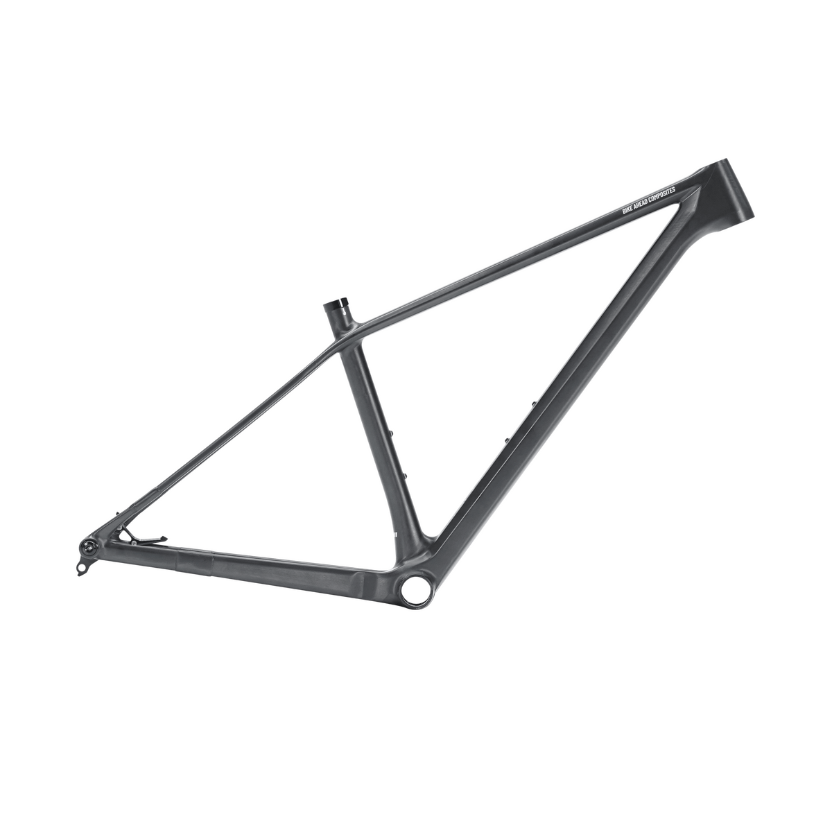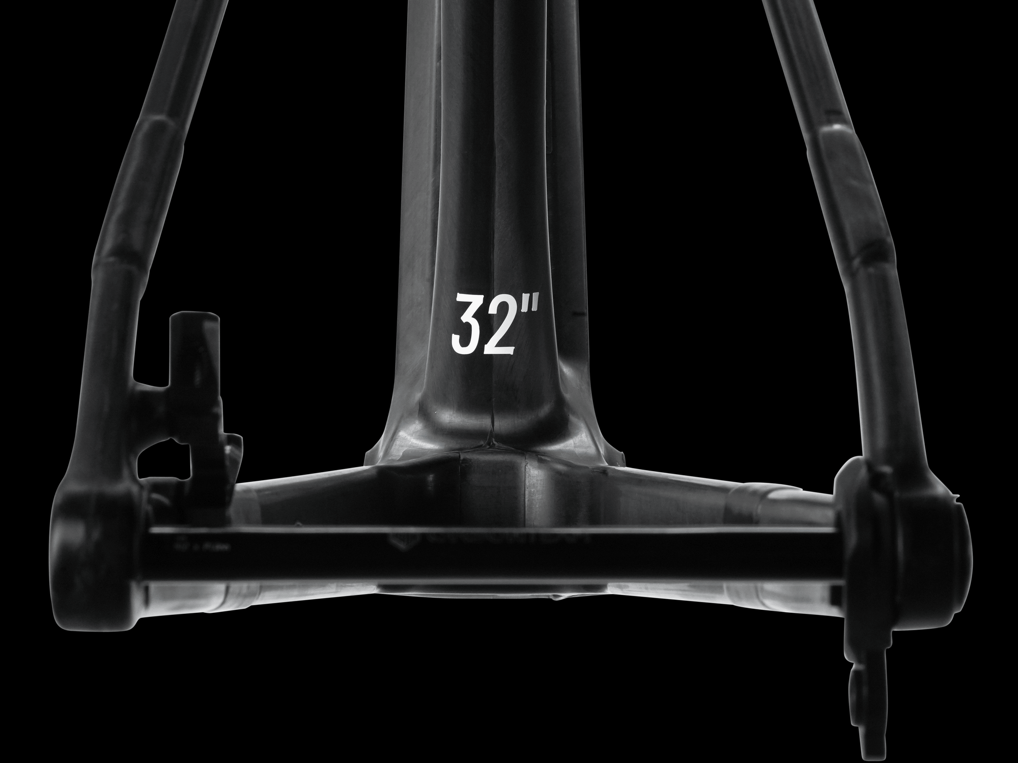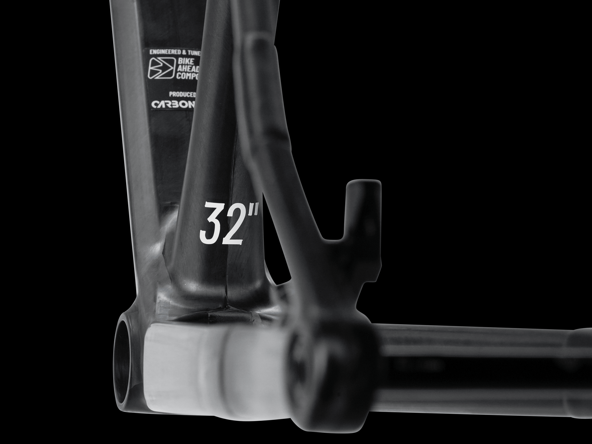 Each frame is built to the uncompromising quality standard that defines Bike Ahead. The platform is our THE FRAME 29—one of the lightest mountain bike frames in the world—re-engineered for 32-inch wheels. A revised carbon layup increases stiffness in the head tube area to manage the higher loads generated by the longer fork. The main frame is manufactured as a single-piece monocoque. The rear triangle is then extended using specially developed dropouts. The bonding process has been extensively validated on test benches at the renowned EFBE testing institute. The brake mount is bolted on.