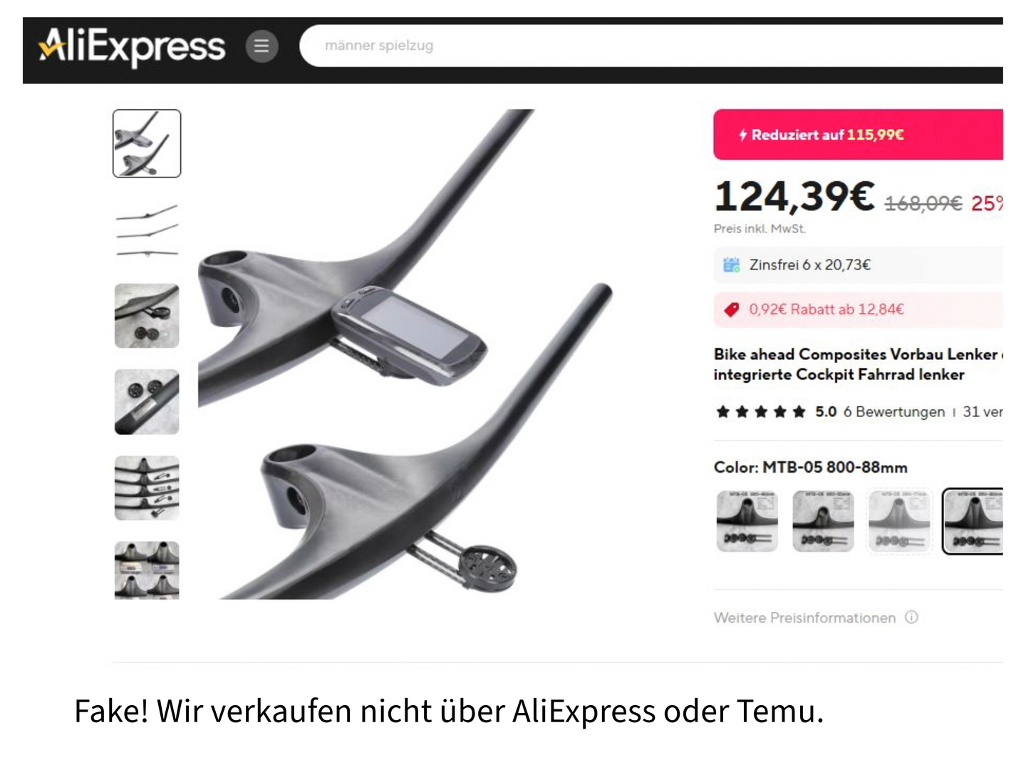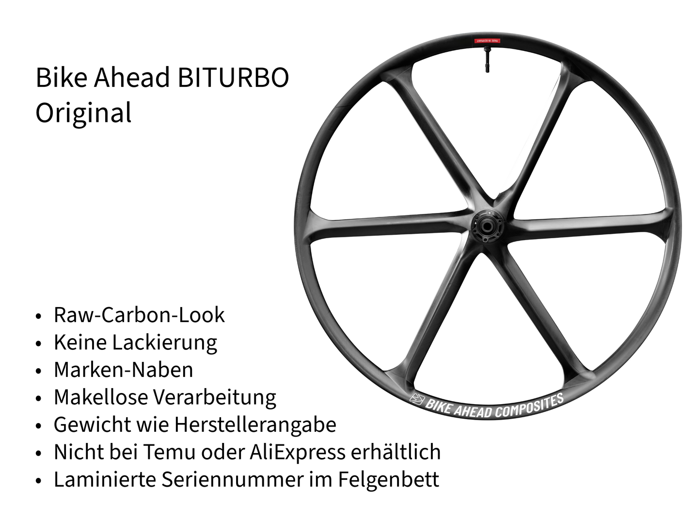 Auf Plattformen wie AliExpress und Temu werden zahlreiche Bike Ahead-Fälschungen aus asiatischer Produktion angeboten. Meist sind es billige Kopien unserer BITURBO-Laufräder und unseres Cockpits THE UNIT. Mit unseren Original-Teilen haben die Kopien nichts zu tun. Wir verkaufen generell nicht über Plattformen wie AliExpress oder Temu, sondern arbeiten ausschließlich mit seriösen Händlern zusammen. Alle Produkte, die auf den genannten Plattformen angeboten werden, sind Fälschungen.
