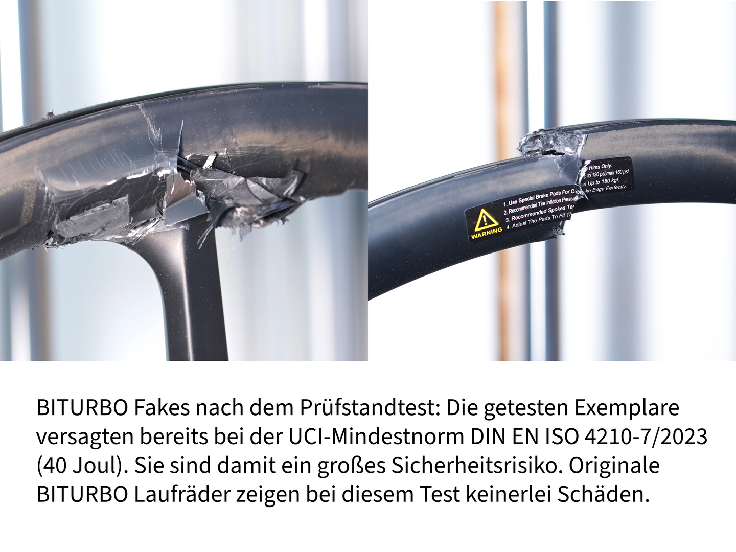 Wir haben mehrere Laufräder, die unter unserem Namen auf AliExpress verkauft werden, im Labor getestet. Keins hat die Prüfnorm ISO 4210-3:2023, 4,6 bestanden. Der Test simuliert den Impact beim Durchfahren eines Schlaglochs. Das heißt, es kann bei den getesteten Laufrädern schon bei einem Schlagloch zu einem starken Schaden bis hin zum Material-Kollaps kommen. Ein massives Risiko! Bei einem der Vorderräder fiel das Gewicht durch die Felge, als wäre sie aus Styropor. Die Fotos sprechen für sich. Wir warnen ausdrücklich vor der Benutzung solcher Laufräder.