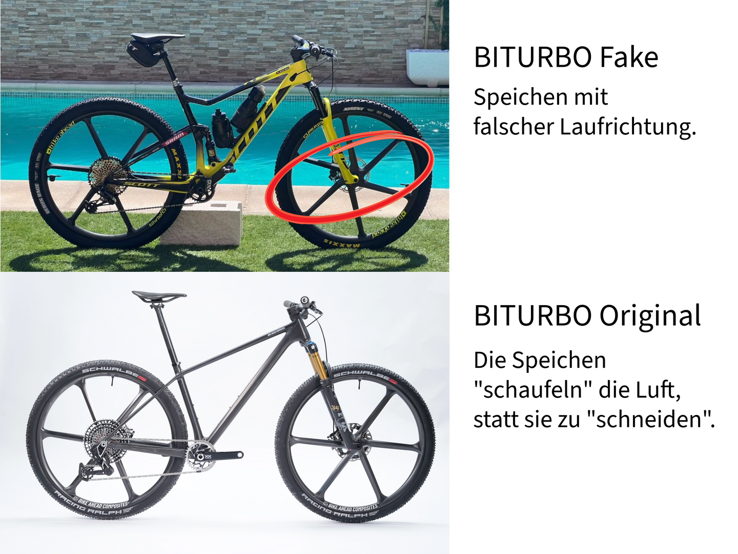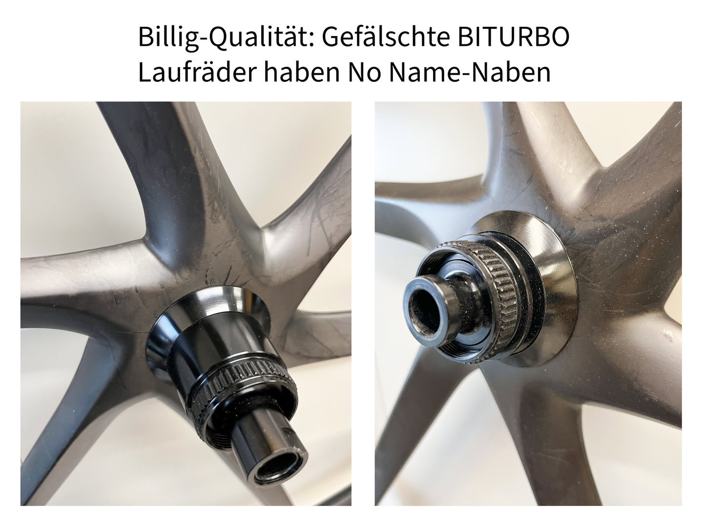 Aktuell sind Fälschungen von unseren BITURBO-Laufrädern im Umlauf. Betroffen sind sowohl die MTB- als auch die Rennrad-Modelle. Auch unser Mountainbike-Cockpit THE UNIT wird als Fälschung angeboten. Bei AliExpress sogar unter unserem Namen. Und mit einem Foto des Originals, welches von der Website unseres offiziellen Partner-Shops R2 Bike kopiert wurde. Dreister kann Betrug nicht sein.