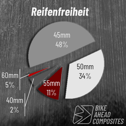 Wir hatten es erwartet: Die meisten wollen 45 Millimeter dicke Reifen fahren. Diese Größe ist im Rennsport etabliert. Sie bietet den besten Schnittpunkt aus Abrollverhalten, Beschleunigung, Gewicht und Grip. Immerhin 34 Prozent wünschen sich noch etwas breitere Reifen. Auch das überrascht uns nicht. Inzwischen sieht man auch bei Gravel-Rennen immer öfter 50-Millimeter-Reifen.
