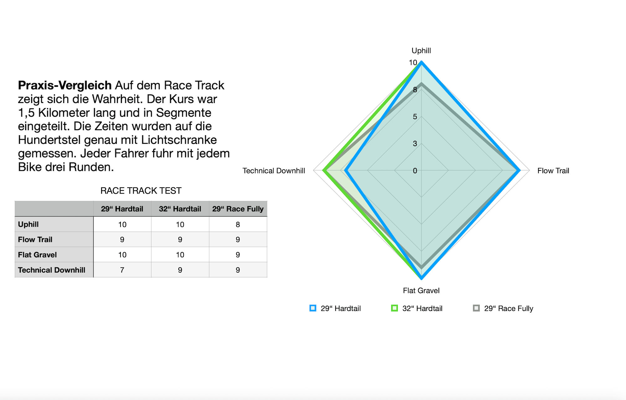- Das Hardtail war mit 32 Zoll-Laufrädern auf der standardisierten Teststrecke mit Waschbrettern 4 Prozent schneller als mit 29 Zoll-Laufrädern und 3 Prozent schneller als das Race Fully.